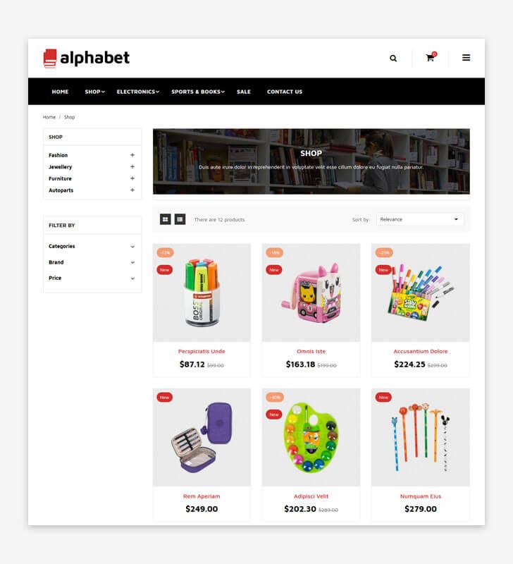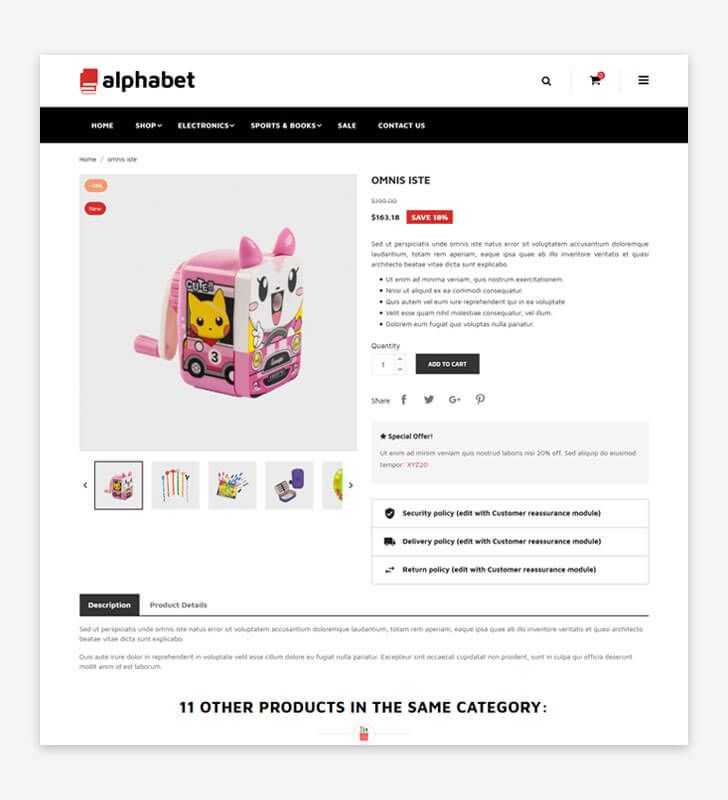 Alphabet is clean, simple and mobile first PrestaShop theme. Specially created for Stationary products. Easy to work with and adapts perfectly to whatever you are selling. Build your brand with powerful features of Alphabet.