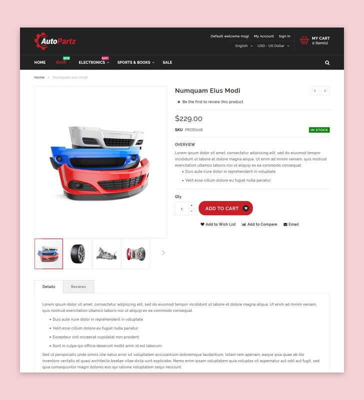 Responsive design makes your store ultra-powerful. A professionally design Mega menu with labels let you navigate customer easily. Quick Add to Cart provide smooth shopping experience. Easy to convey your product features with Product Tab. AutoPartz truly designed to drive your sales.