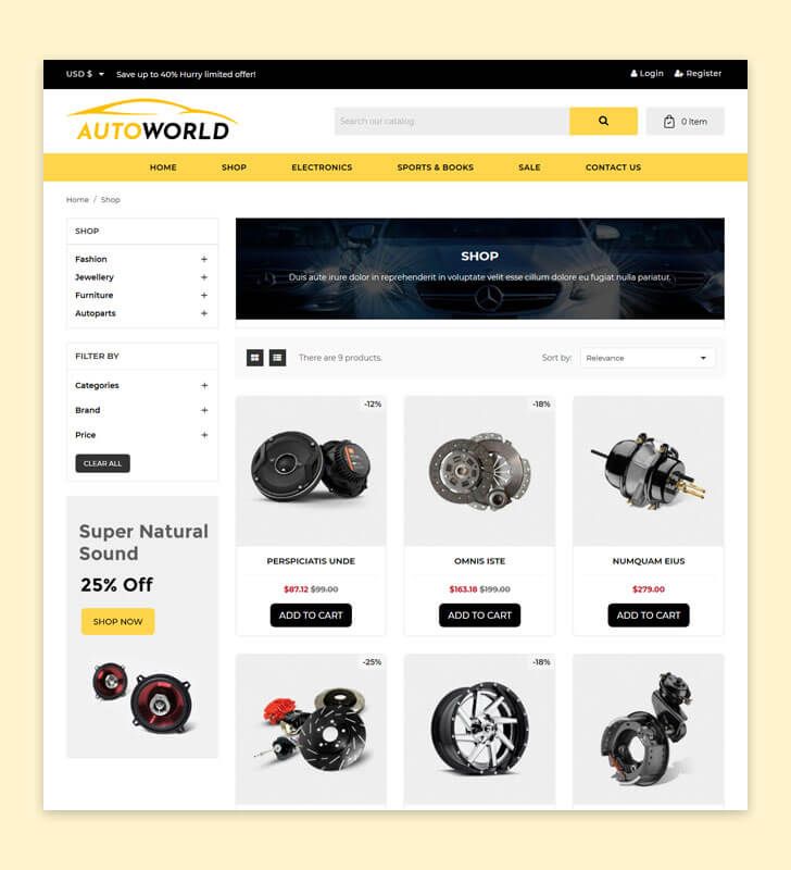 A professionally design Mega menu let you navigate customer easily. Quick Add to Cart provide smooth shopping experience. Easy to convey your product features with Product Tab. Scroll to Top creates happy browsing experience. Promote your new product with Newsletter Popup. Increase your Social share with Social Sharing Tool. AutoWorld truly designed to drive your sales.
