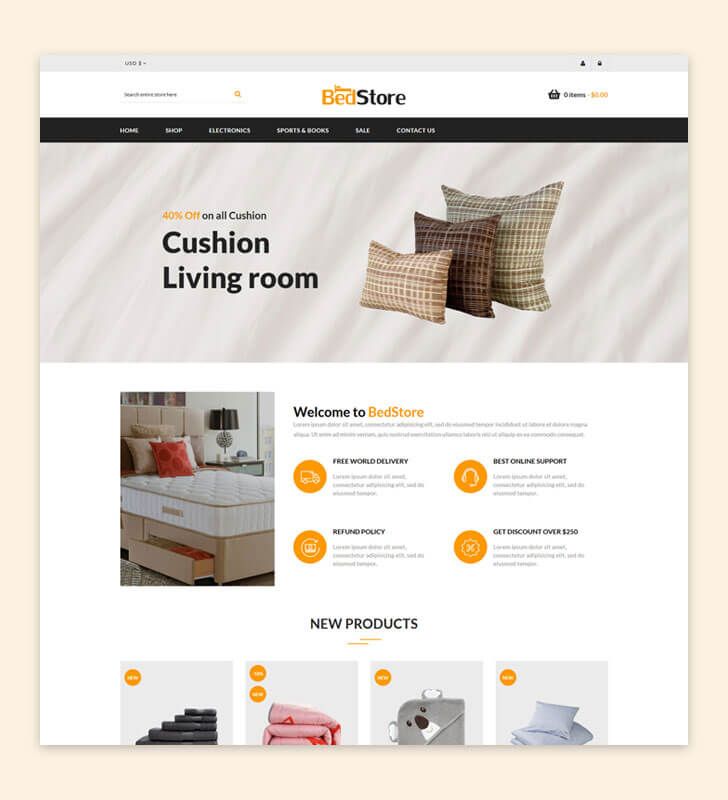 This theme is fully responsive, that's look perfect on any device. Create a memorable impression with its classic design layouts. Promotion bar helps to promote your sale. Let your product shine with Look book features. Easy to convey your product features with Product Tab. Scroll to Top creates happy browsing experience. Promote your new product with Newsletter Popup. Increase your Social share with Social Sharing Tool. Bedstore helps you to grow your online business.