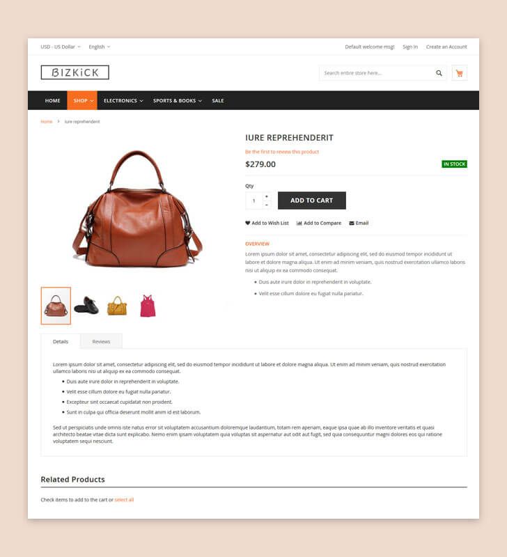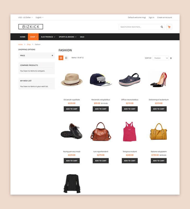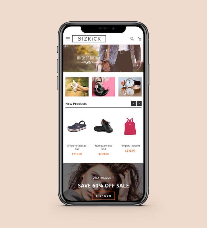 The clean and classy layout makes your store more professional. Grab your customer attention with New and Sale product labels. Easy to convey your product features with Product Tab. Responsive design makes the perfect look on any device. Bizkick is a perfect fit for Fashion Store.