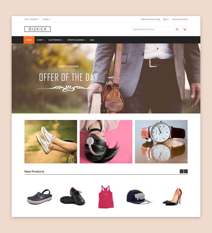 Bizkick is a professionally design free responsive Magento 2 theme. Bizkick is perfect for Fashion Store, Accessories Store, Shoes Store, and Apparel Store. The theme is professionally designed and hand-coded according to current Magento standards, which help your ranking in search engines like Google, Yahoo etc.