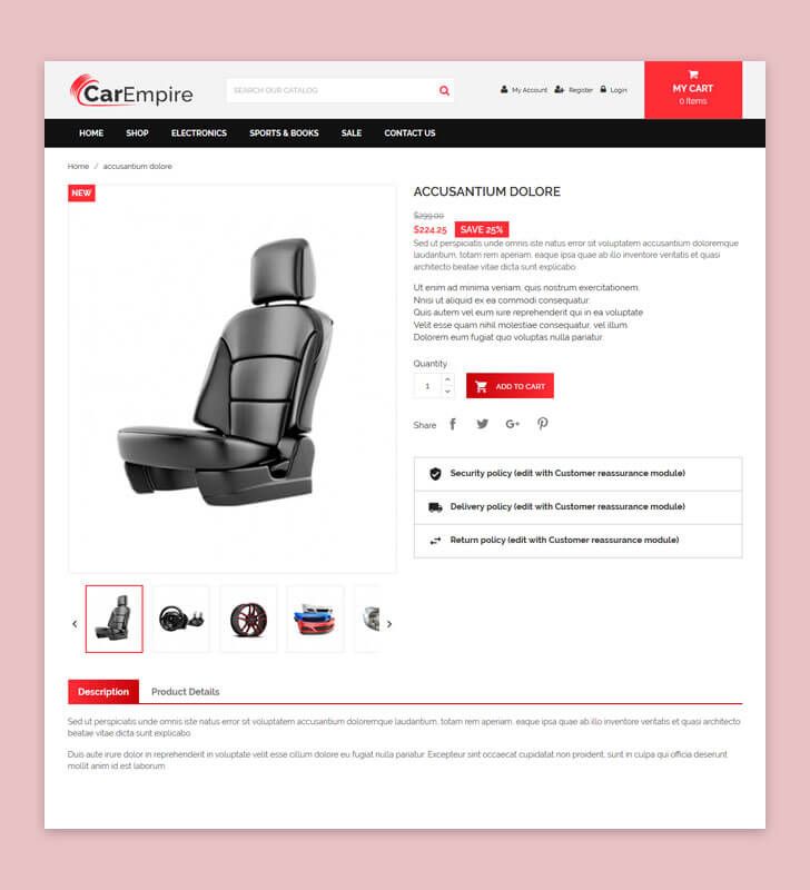 A professionally design Mega menu let you navigate customer easily. Quick Add to Cart provide smooth shopping experience. Easy to convey your product features with Product Tab. Scroll to Top creates happy browsing experience. Promote your new product with Newsletter Popup. Increase your Social share with Social Sharing Tool. CarEmpire truly designed to drive your sales.