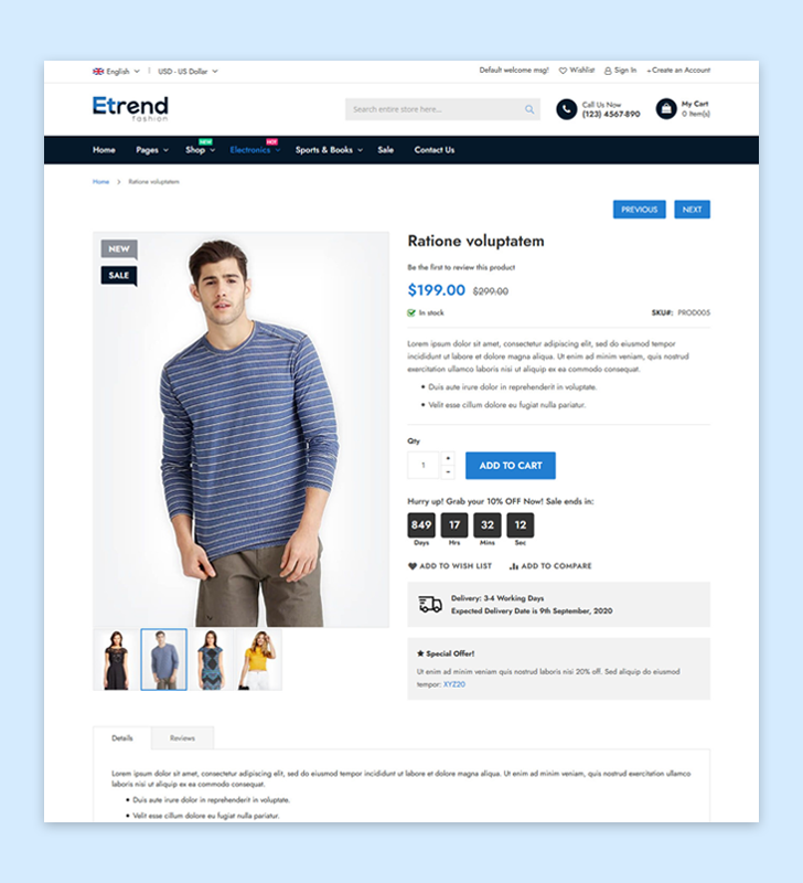Show offers, news and coupons and drive customer attention with fully customizable and sliding Promotion Bar. Get more sales with Sticky Add to Cart bar on every product page. With Etrend Magento 2 Theme convert your visitors into customers.