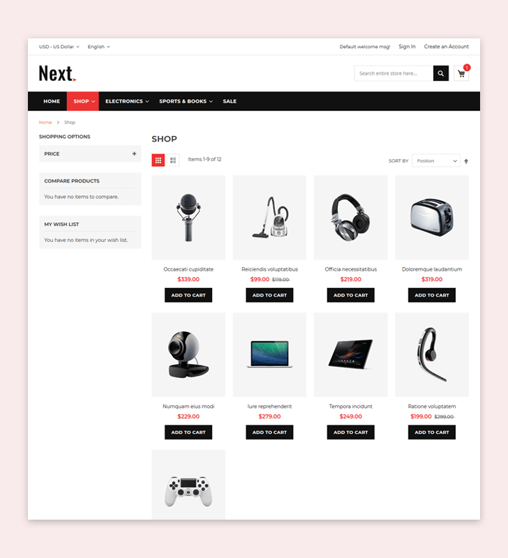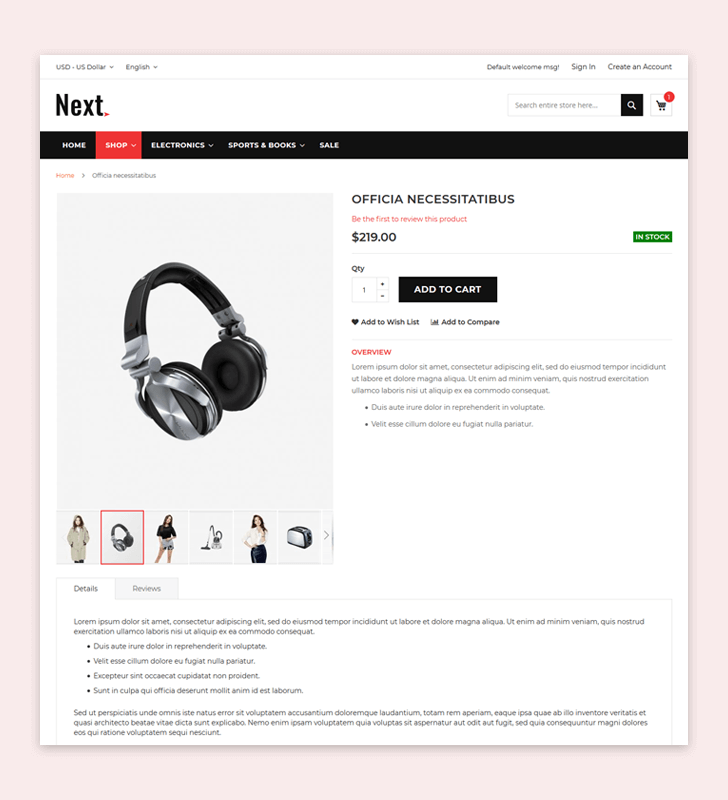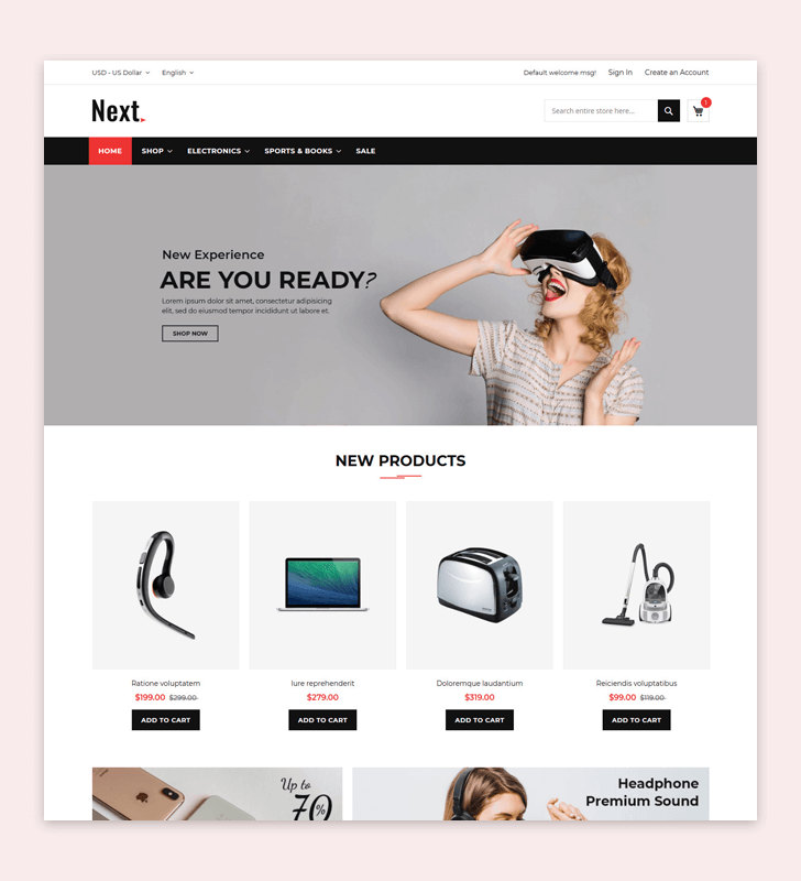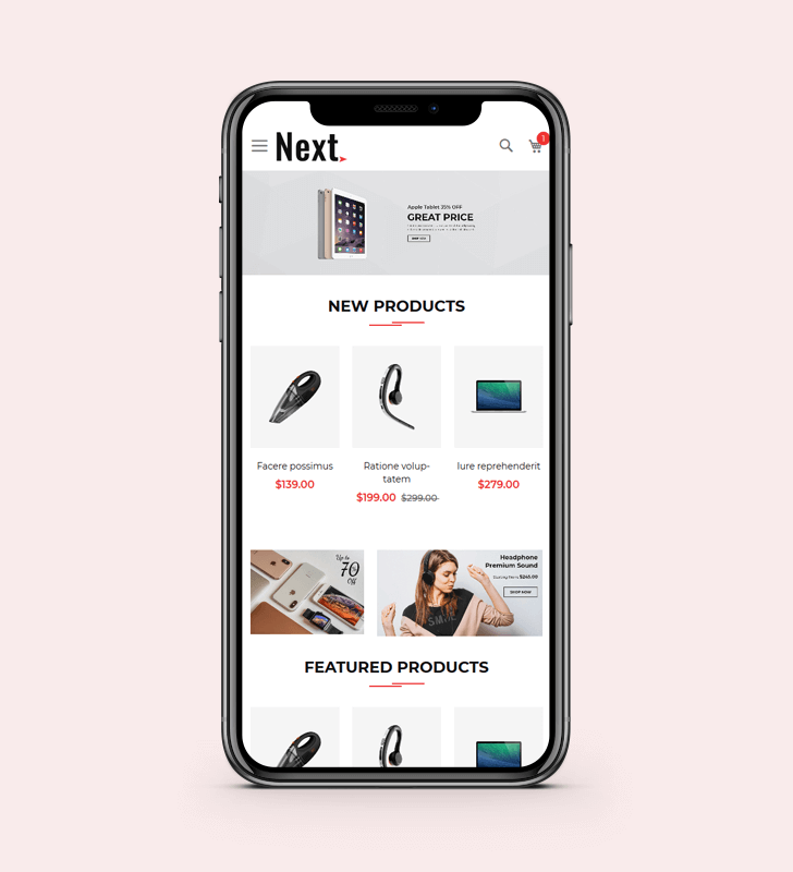 The clean and classy layout makes your store more professional. Grab your customer attention with unique block design. Easy to convey your product features with Product Tab. Responsive design makes the perfect look on any device. Next is a perfect fit for Digital Store.