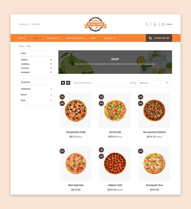 The clean and classy layout makes your store more professional. Grab your customer attention with New and Sale product labels. Easy to convey your product features with Product Tab. Responsive design makes the perfect look on any device. Scroll to Top creates happy browsing experience. Promote your new product with Newsletter Popup. Increase your Social share with Social Sharing Tool. Pizza Zone is perfect fit for Food and Beverages Store.