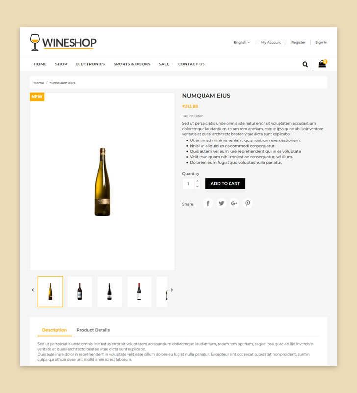 A professionally design Mega menu let you navigate customer easily. Quick Add to Cart provide smooth shopping experience. Easy to convey your product features with Product Tab. Scroll to Top creates happy browsing experience. Promote your new product with Newsletter Popup. Increase your Social share with Social Sharing Tool. WineShop truly designed to drive your sales.